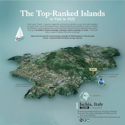 09012022 1. Ischia, Italy - Nestled in the gulf of Naples about an hour away from the mainland, this charming volcanic island takes first place because of its charming villages, pristine beaches, and welcoming locals. It’s also well-known for its hot springs, which are easily accessible by either taxi or public transport. Ranked: The Top 25 Islands to Visit in 2022 | Visual Capitalist